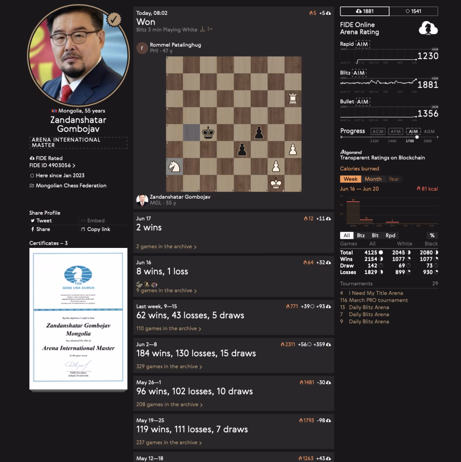 El presidente de la Federación de Mongolia llega a la última fila de la política de su país y se convierte en presidente. No tiene Elo oficial, pero juega con frecuencia en la plataforma de la FIDE, donde tiene el título de MI.