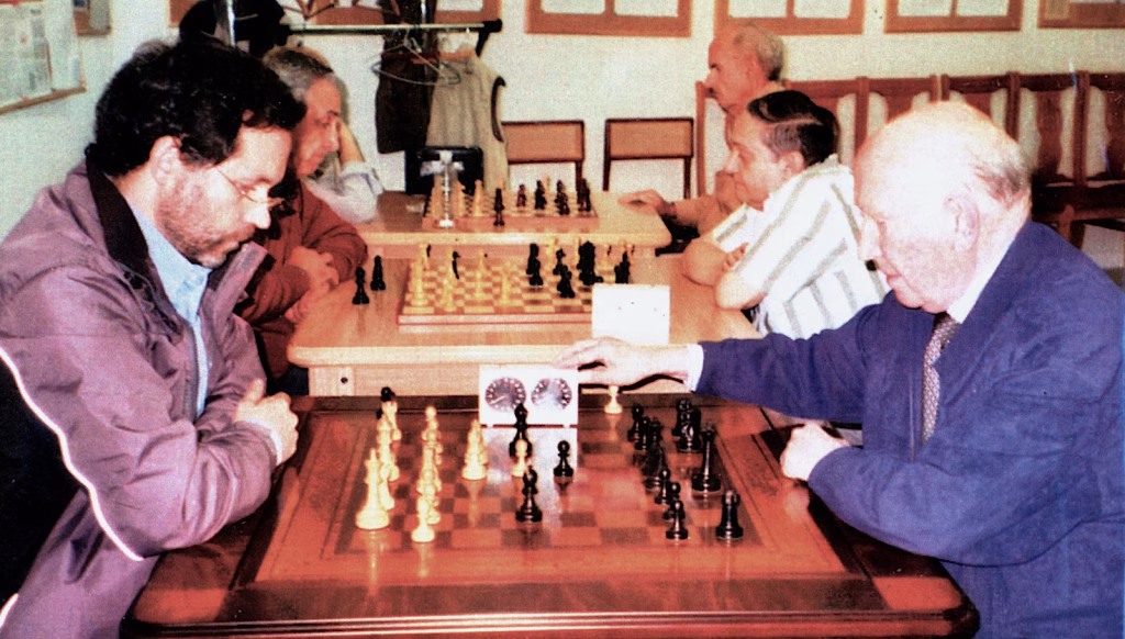 En la imagen de arriba, que ya tiene algunos años, Juan Carlos Sanz juega una partida con el gran maestro Jesús Díez del Corral (1933-2010), «el Botvinnik español».