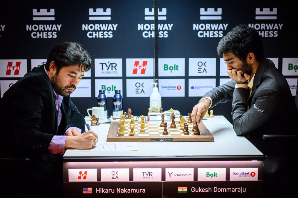 En la tercera partida del día, también cayó uno de los tres primeros clasificados. Fabiano Caruana sigue líder en el Norway Chess, pese a sucumbir ante la determinación del otro gran maestro indio del torneo. Arjun Erigaisi necesitó 70 jugadas para imponerse de una forma muy parecida a Nakamura, en un final con el mismo material: damas, una torre y alfiles de distinto color, que por lo visto no son tan tablíferos como se comenta.
